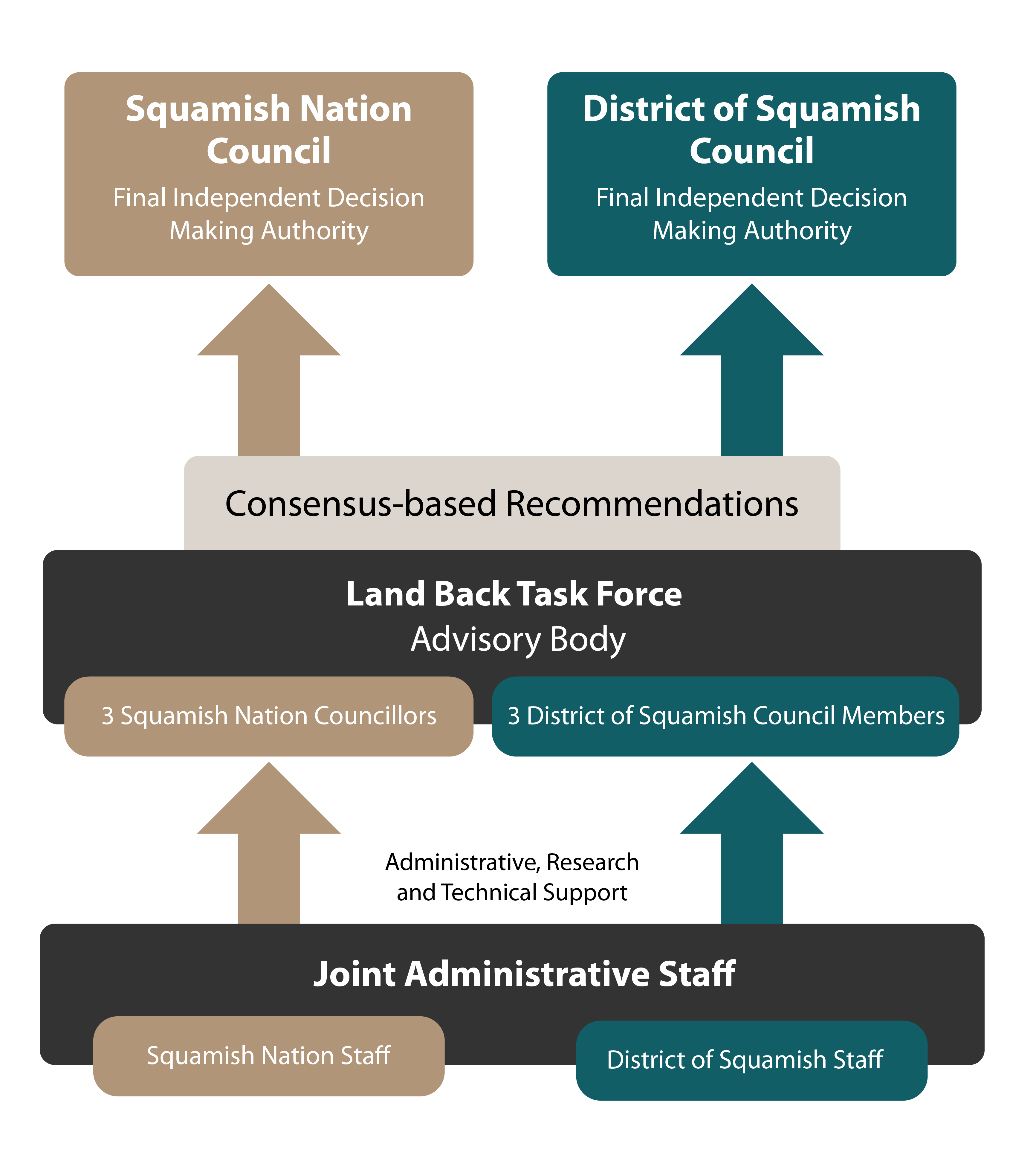 All final decisions regarding Land Back initiatives, policy changes, or land dispositions remain solely with the Sḵwx̱wú7mesh Nation Council and District of Squamish Council. Final approval of the Land Back framework and associated recommendations must be granted by both Councils.