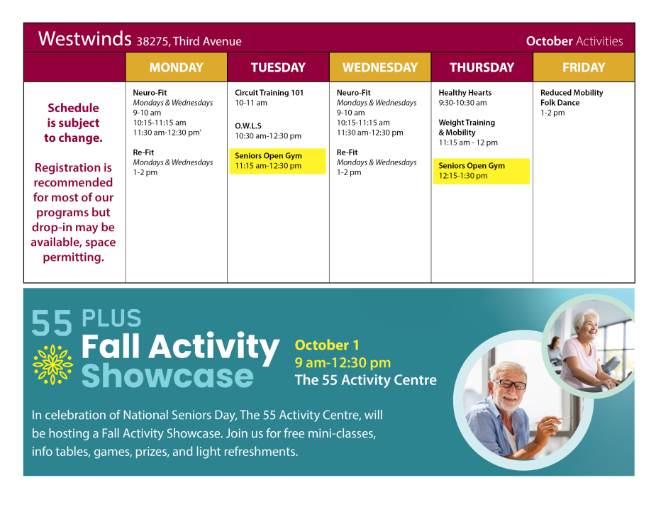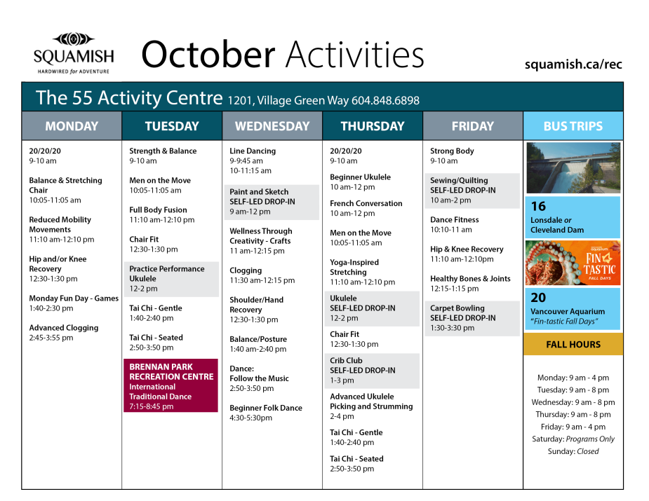 The social and physical health and wellbeing of our growing aging population is very important to us at the District of Squamish and we work hard to provide a range of recreation and culture programming and spaces to meet the diverse needs of our seniors. Programming for the seniors community is currently offered across three facilities in Squamish – Brennan Park Recreation Centre, The 55 Activity Centre and the Westwinds Seniors Hub, the newly acquired space within the Westwinds Seniors Living Building.