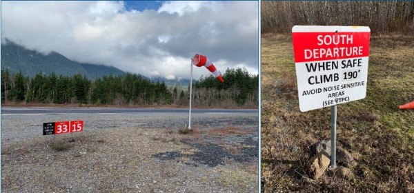 Instruction Sign and Wind Direction Indicator (left) and Runway 15 Noise Mitigation Information Sign (right)