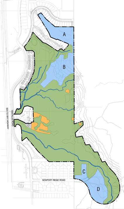 The overall park design can be viewed online. The focus of the park area is habitat restoration from the previous golf course use, as well as a main active “hub park” near the Tantalus Road entrance providing play areas, picnic areas, bike wash station, washrooms and other facilities. A trail network runs through the active park area and links the main residential “nodes” on the site. Once completed, access to the park and trails will be available from Dowad Drive, Tantalus Road and Newport Ridge Drive. Final details of the park design are being completed and will be secured in a Servicing Agreement with the developer.